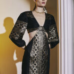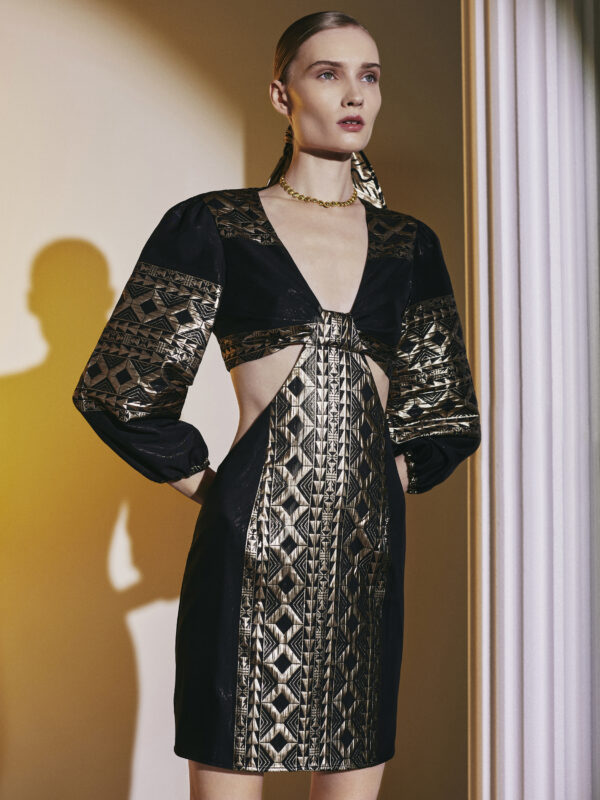 – Μίνι φόρεμα με χρυσές λεπτομέρειες και φερμουάρ στο πίσω μέρος του φορέματος