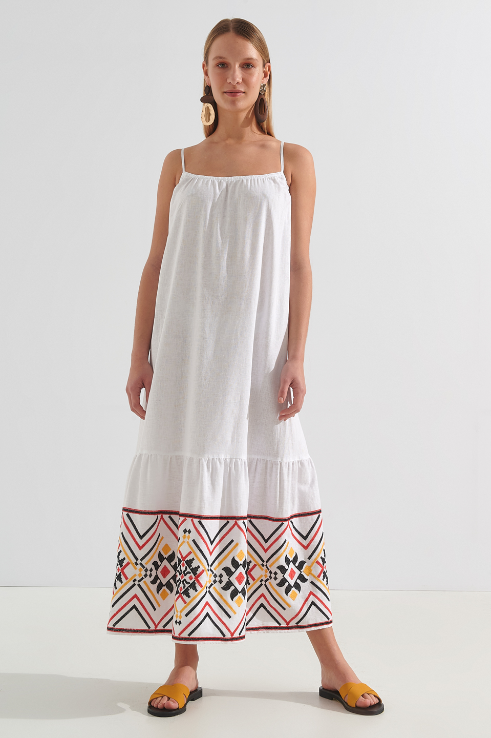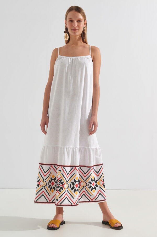 – Μακρύ φόρεμα με κεντήμα στο τελείωμα