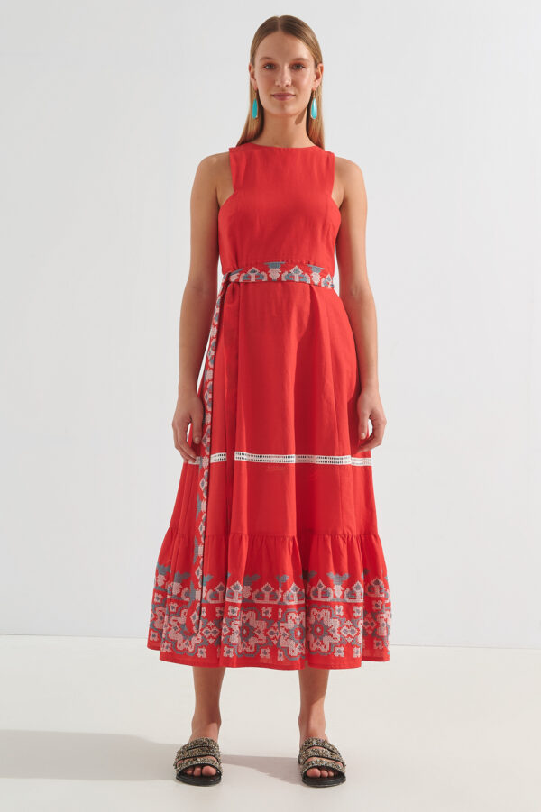 – Φόρεμα με κεντήματα και ζώνη στη μέση