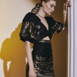 – Mini φόρεμα με λάστιχο στη μέση, χρυσά κεντήματα και φουσκωτά μανίκια