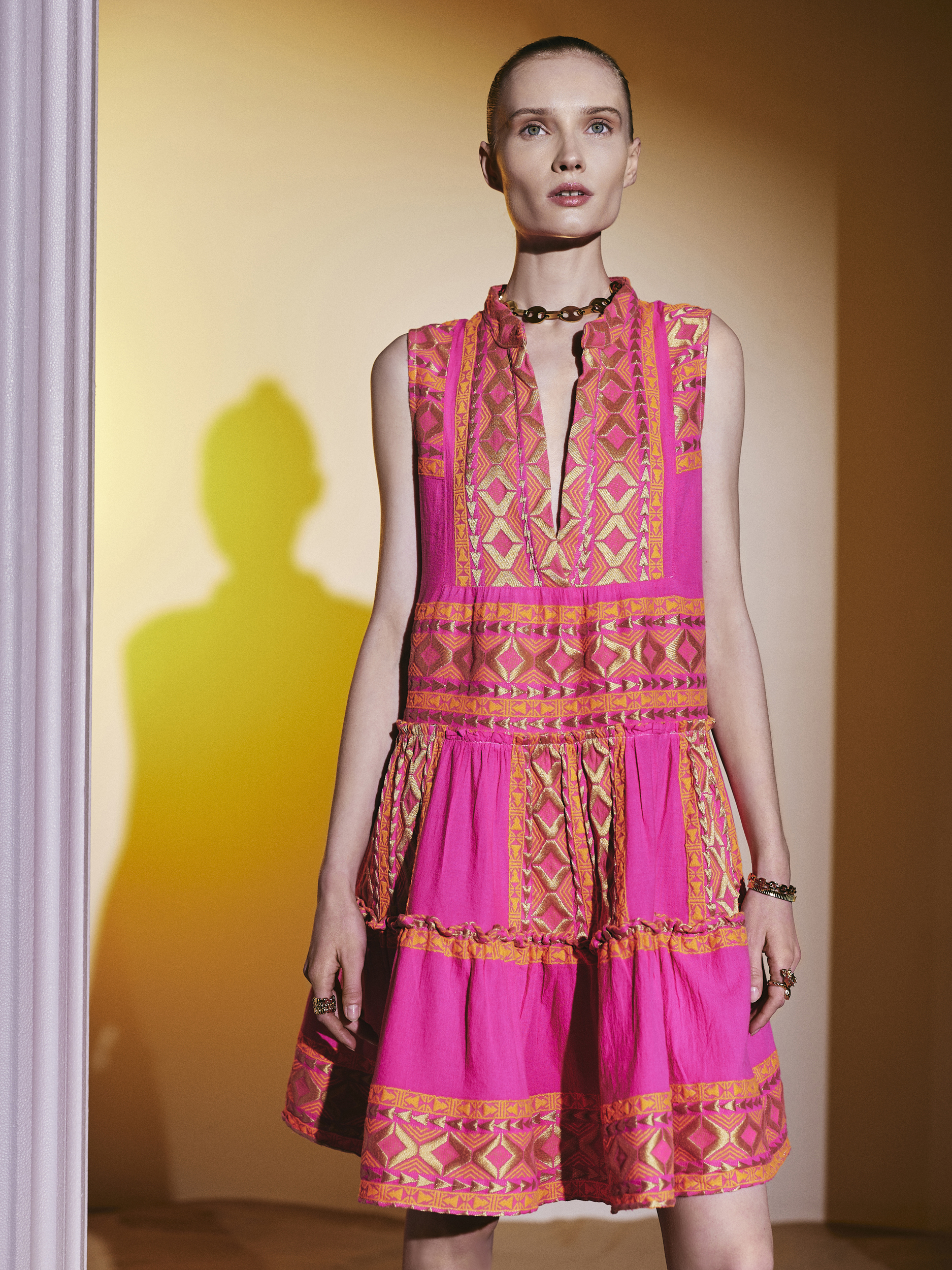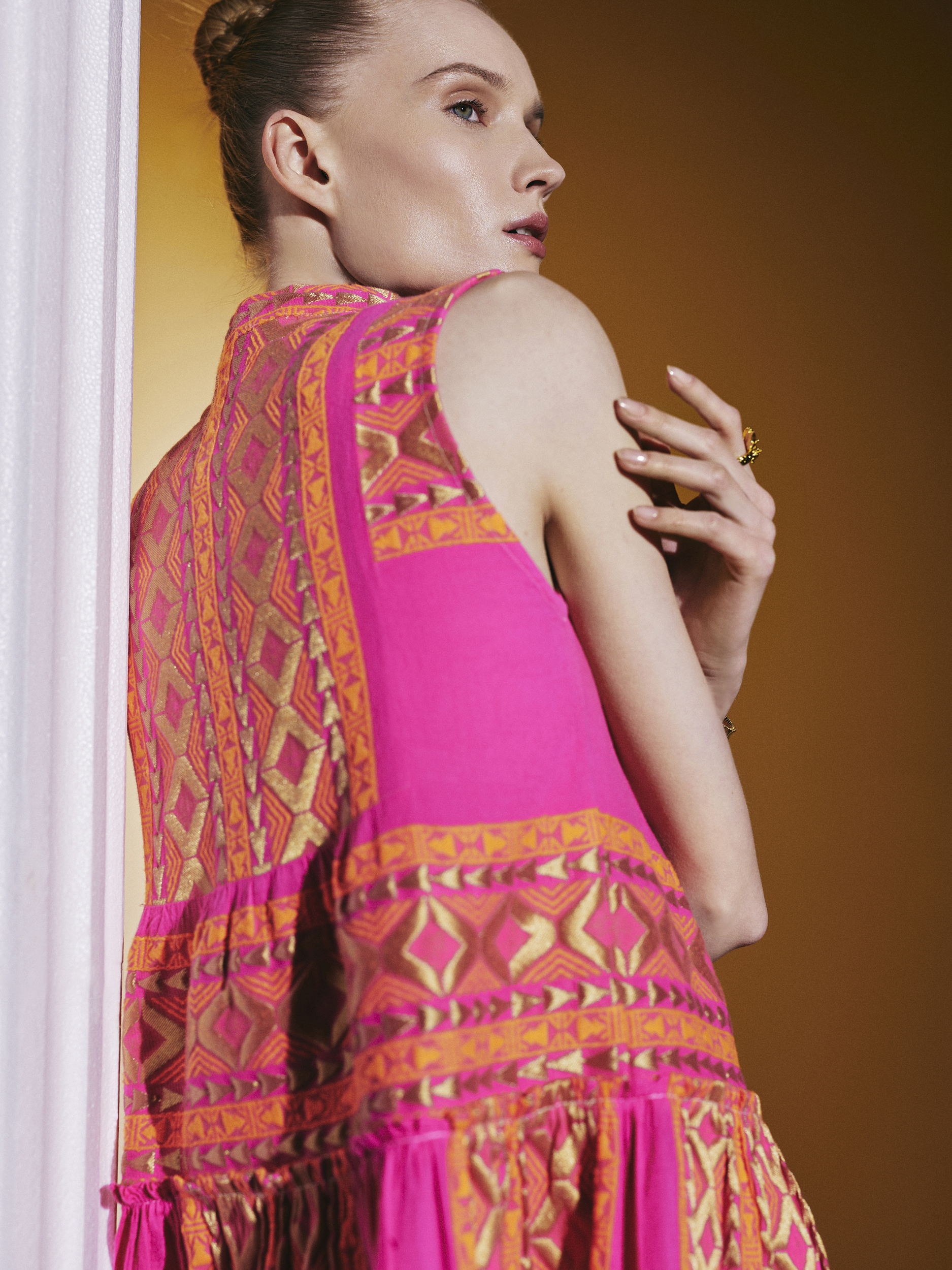 – Μινι φόρεμα με φούξια βάση και χρυσά και πορτοκαλί κεντήματα