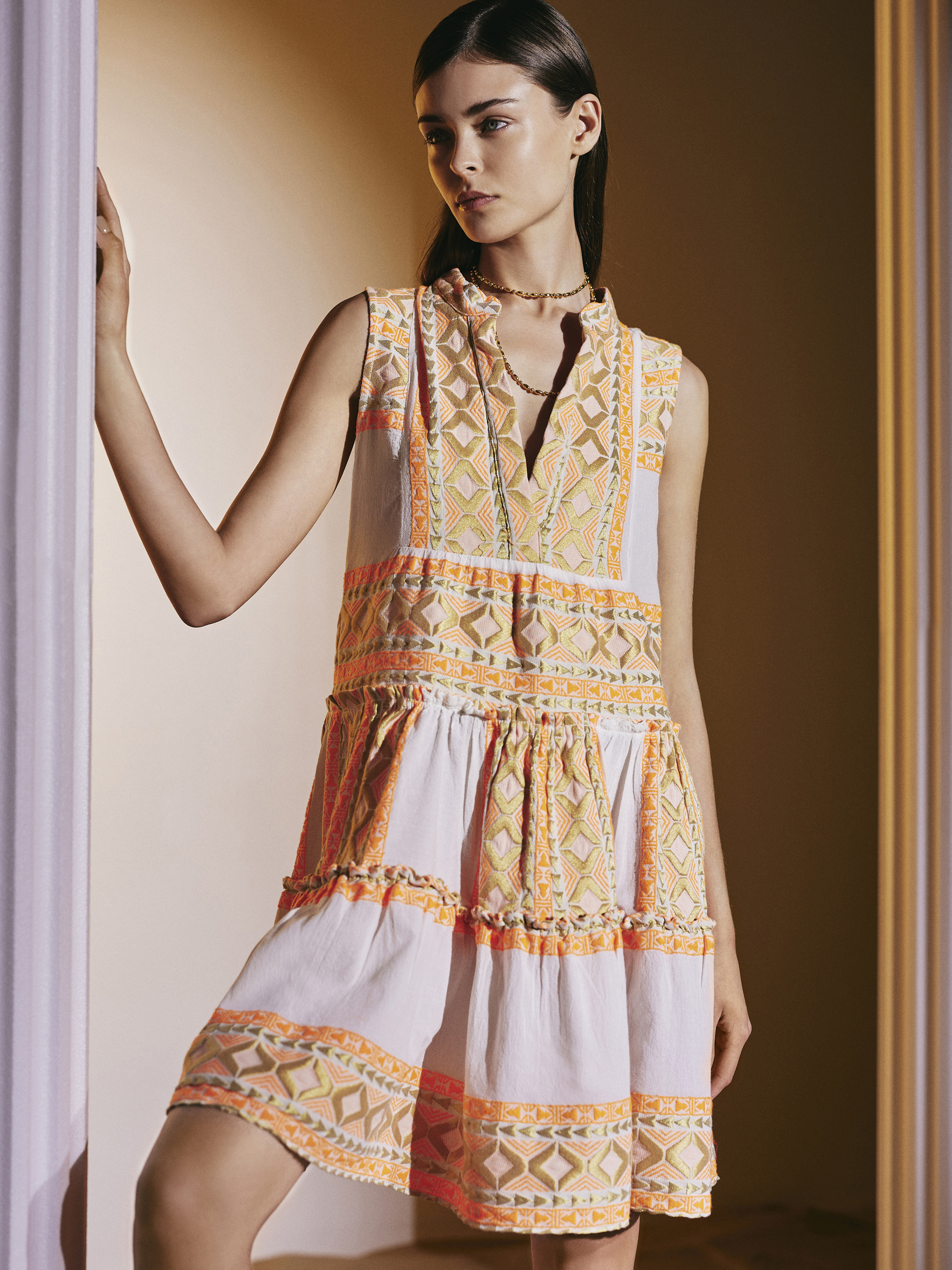 – Μινι φόρεμα με λευκή βάση και χρυσά και πορτοκαλί κεντήματα