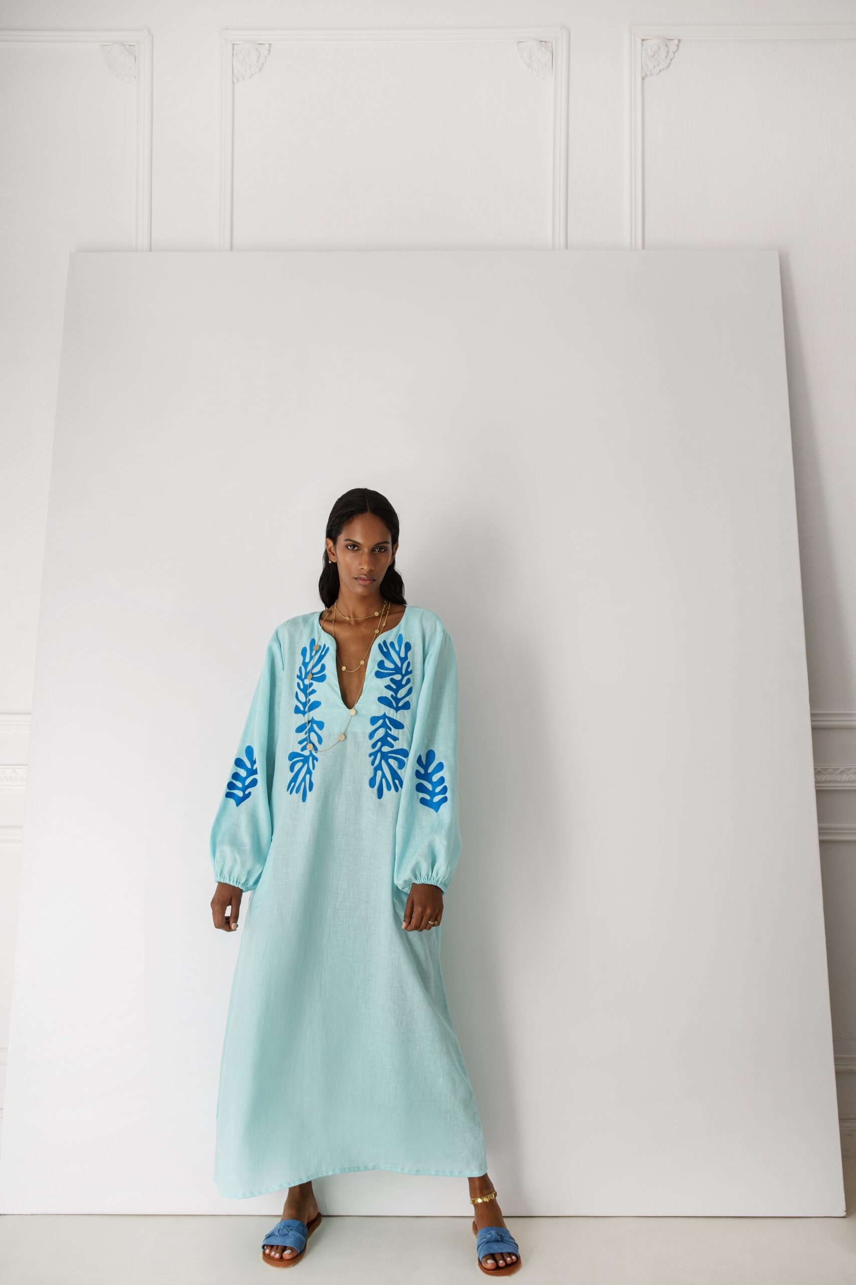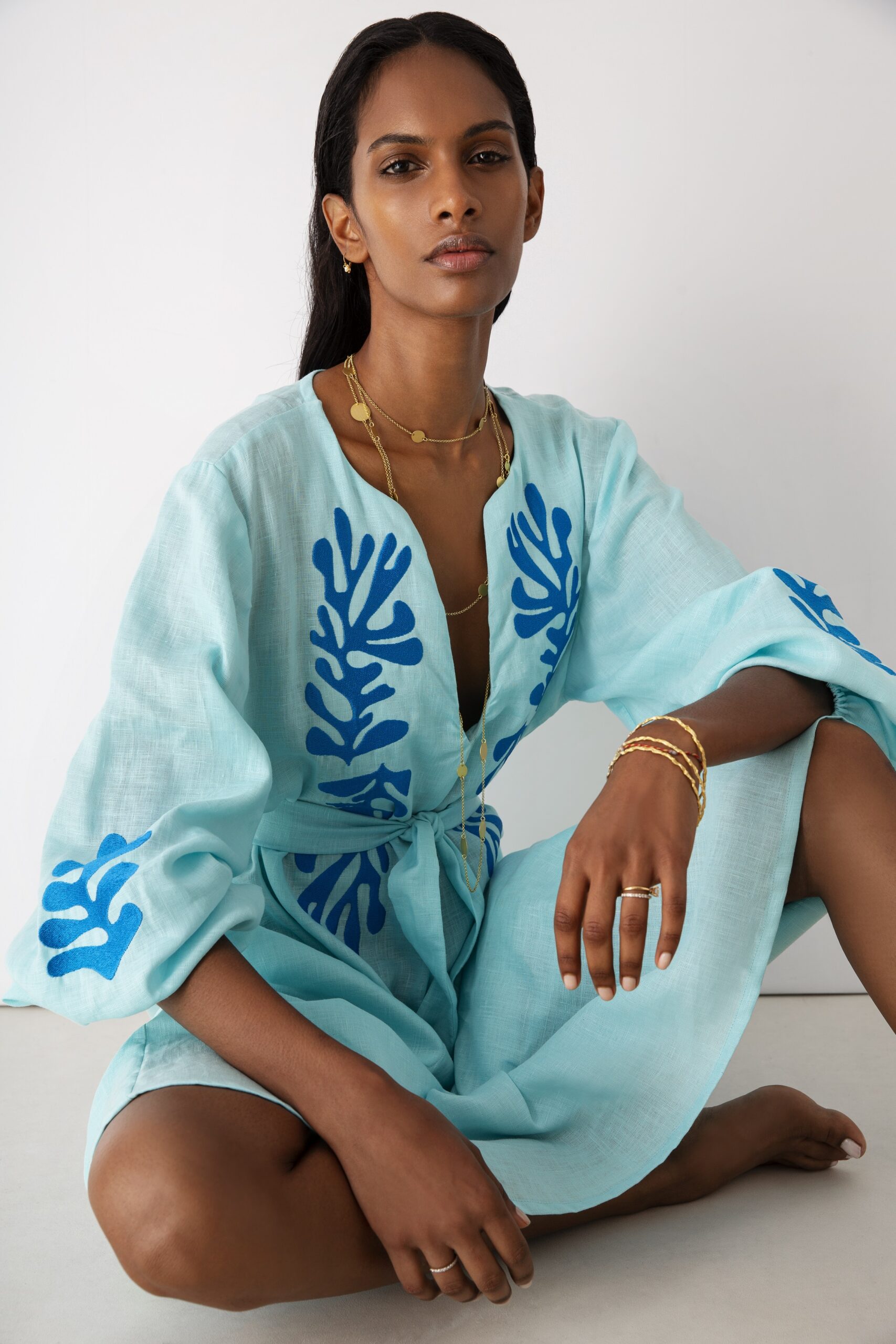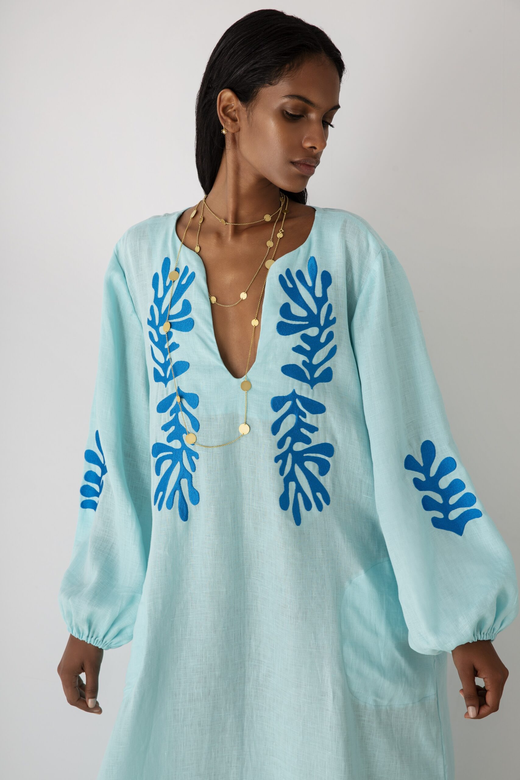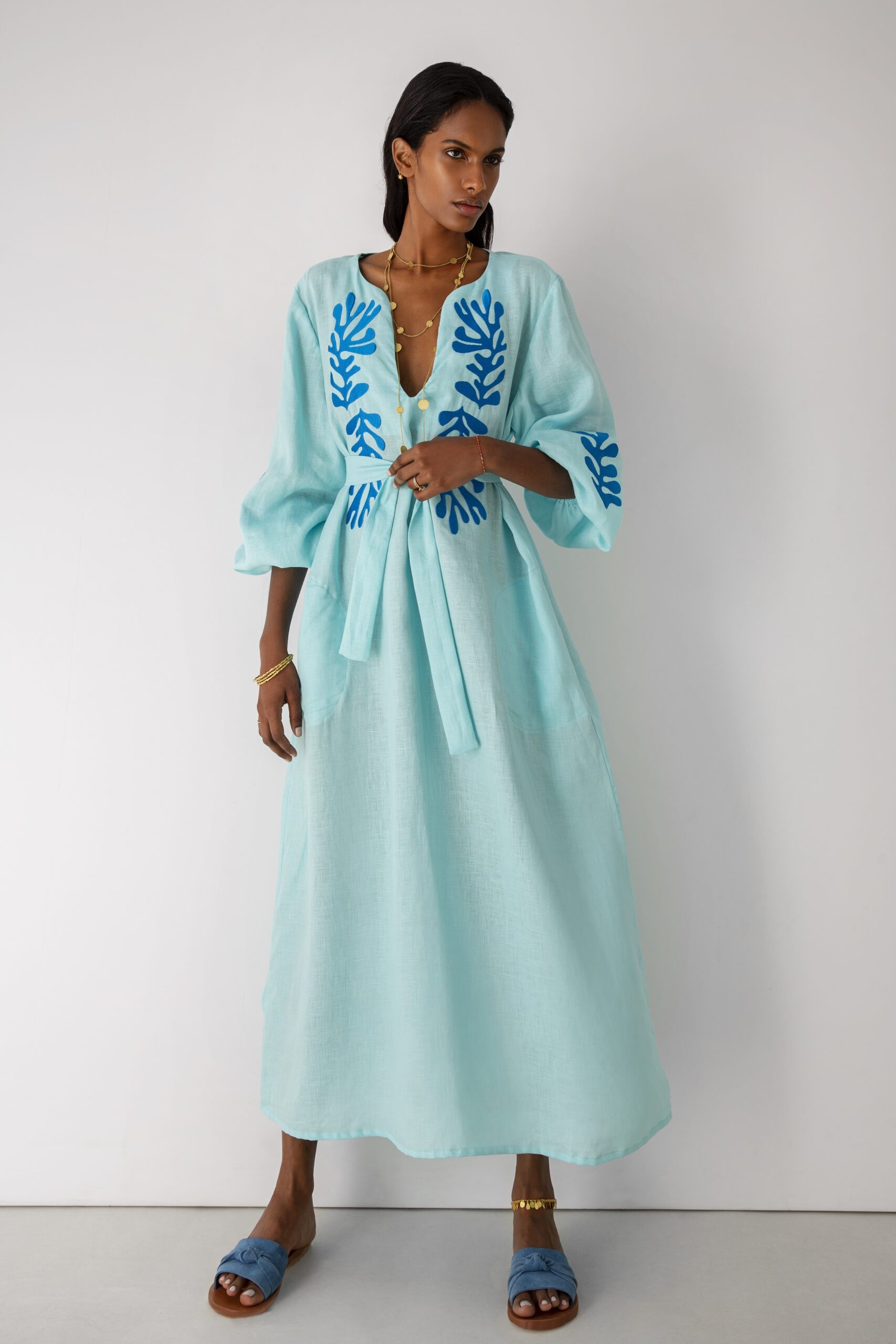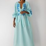 – Φόρεμα με ζώνη στη μέση και μπλε κεντήματα