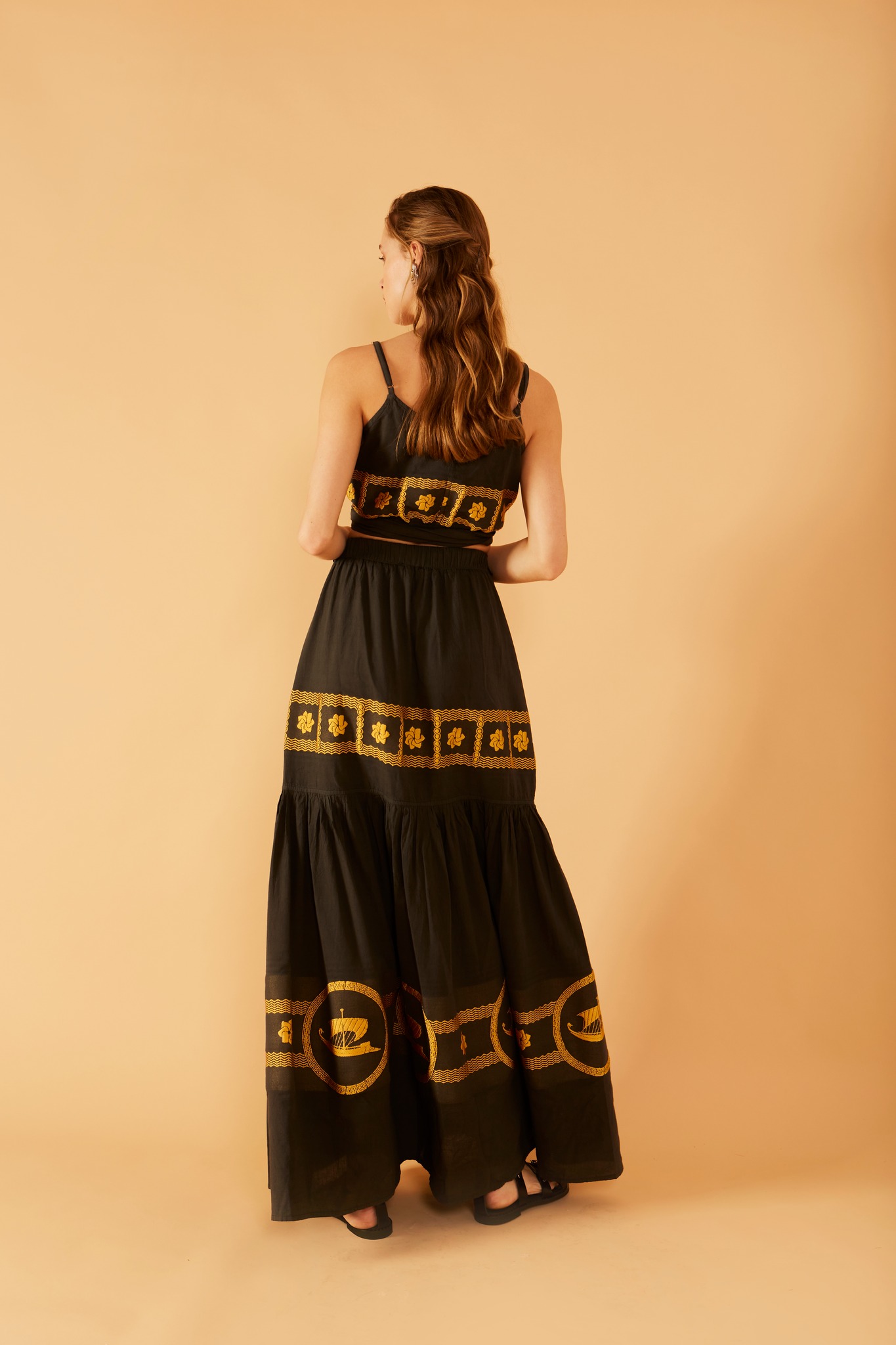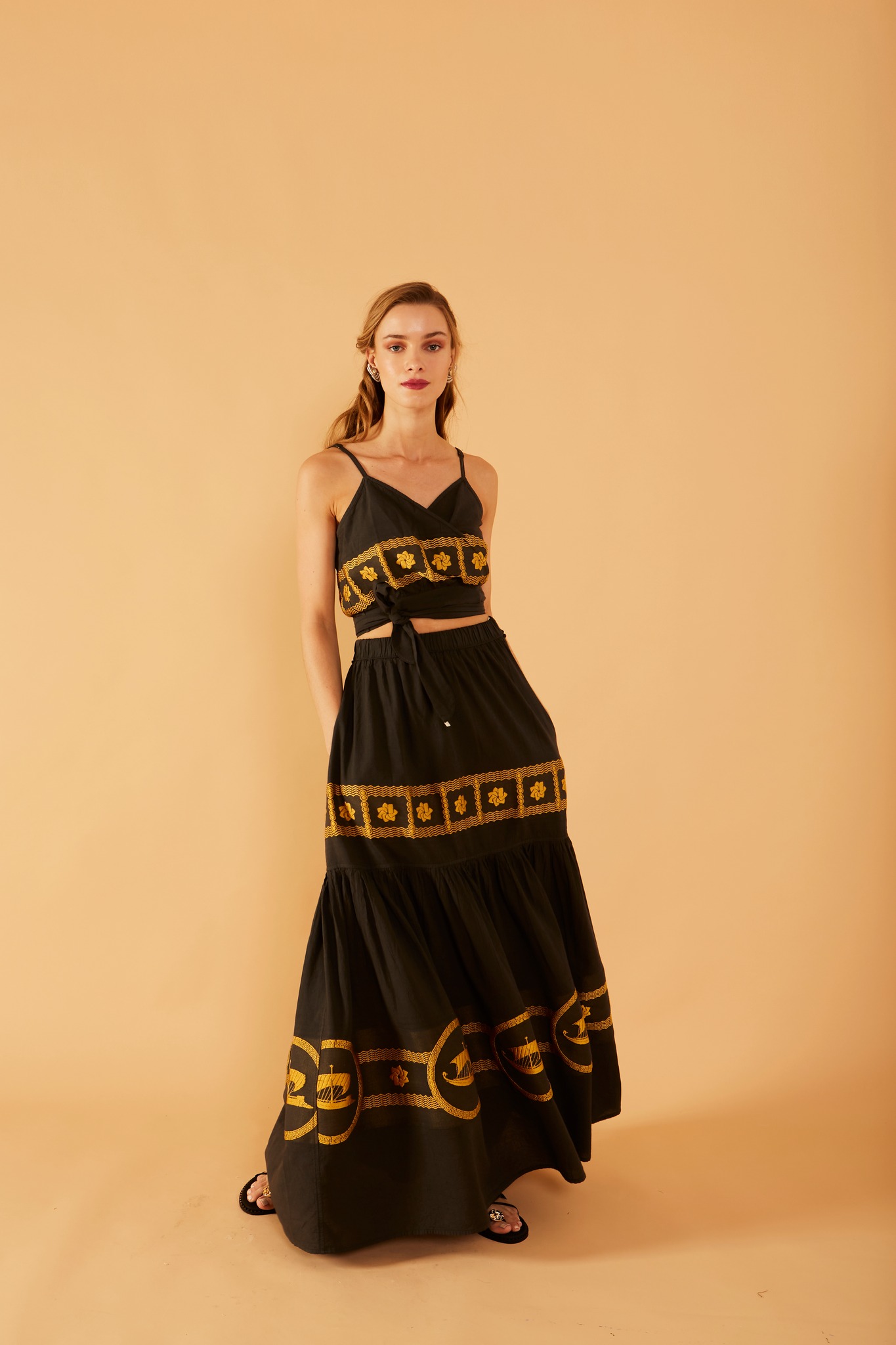 – Μάξι φούστα με λάστιχο στη μέση, χρυσά κεντήματα και τσέπες