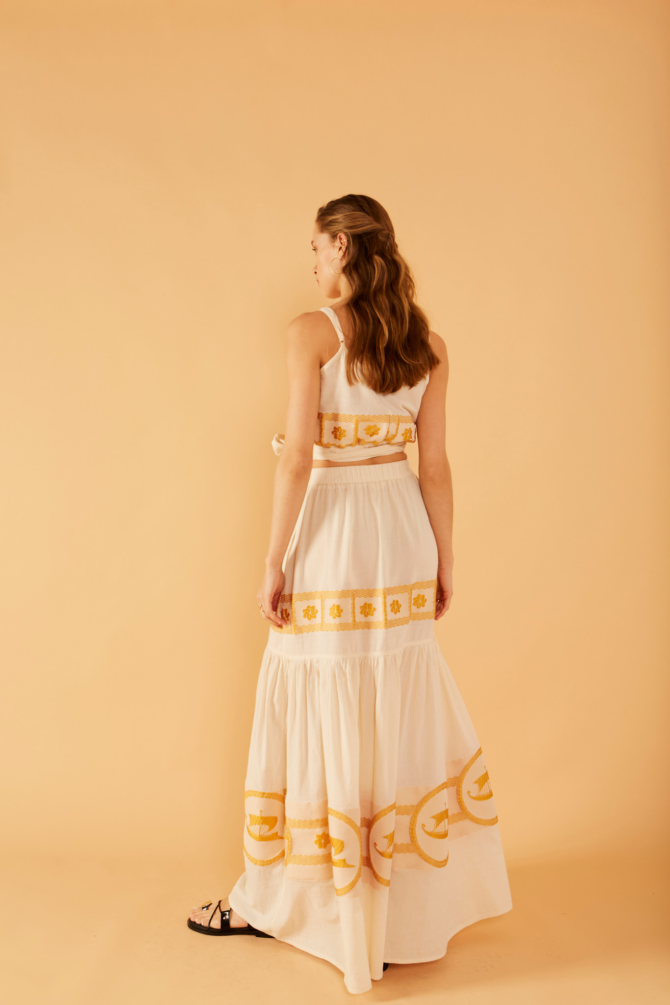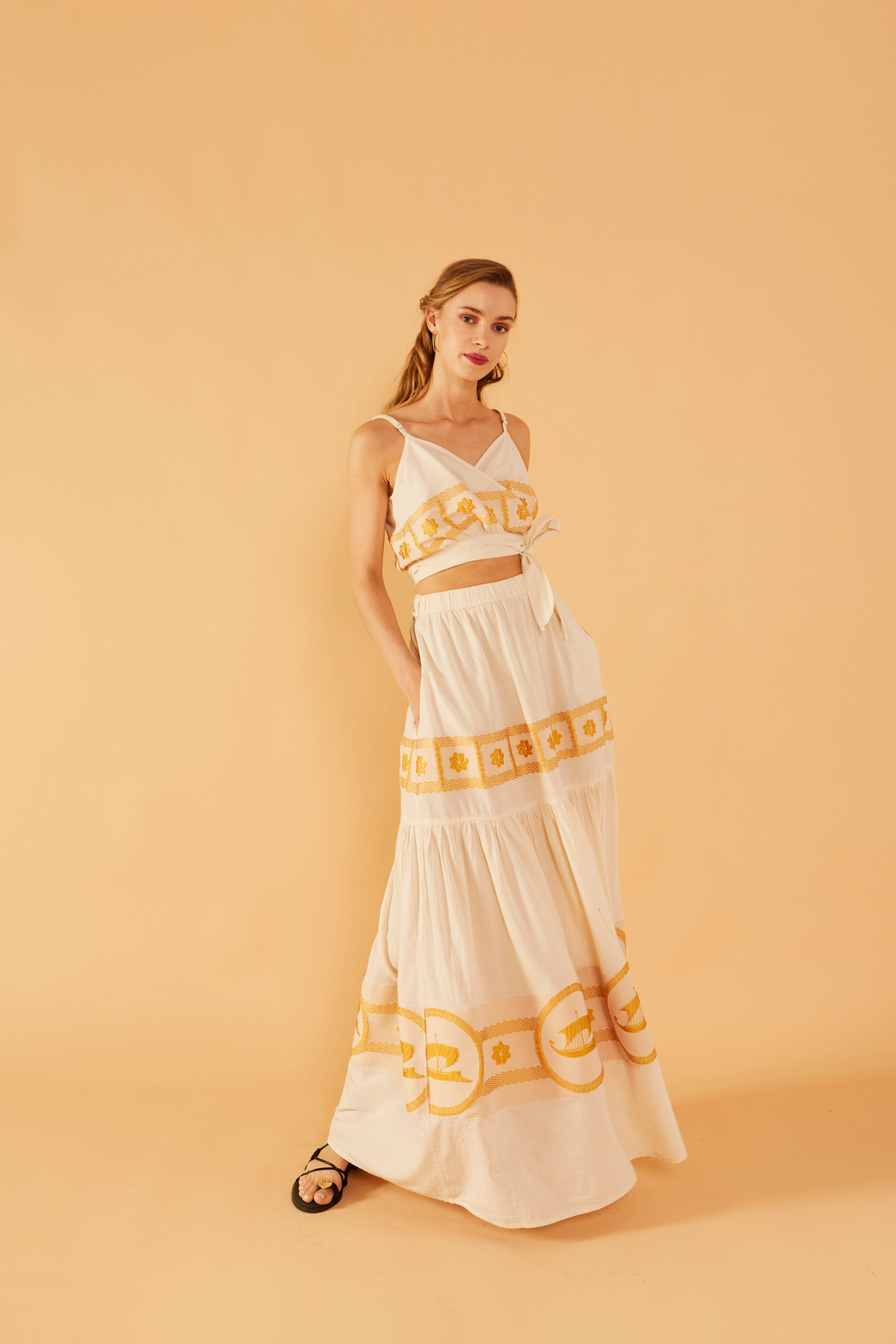 – Μάξι φούστα με λάστιχο στη μέση, χρυσά κεντήματα και τσέπες