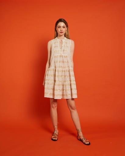 – Σύνθεση : 100% COT – 100% POL – Μίνι φόρεμα με χρυσά κεντήματα – Αμάνικο φόρεμα με ανοιχτή λαιμόκοψη