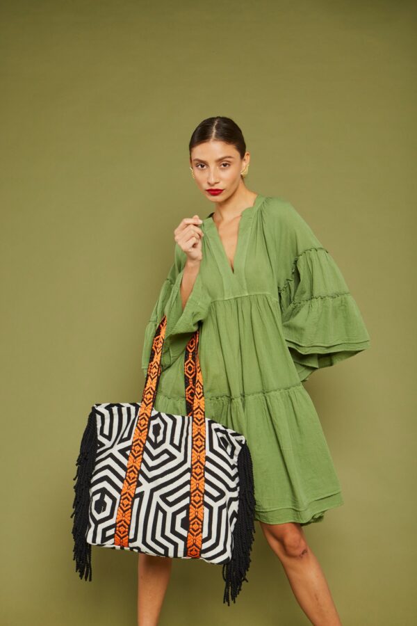 – 100% cotton – Τσάντα ώμου με εσωτερικό τσεπάκι και φόδρα – Κρόσσια στα πλαϊνά και πορτοκαλί λουρί