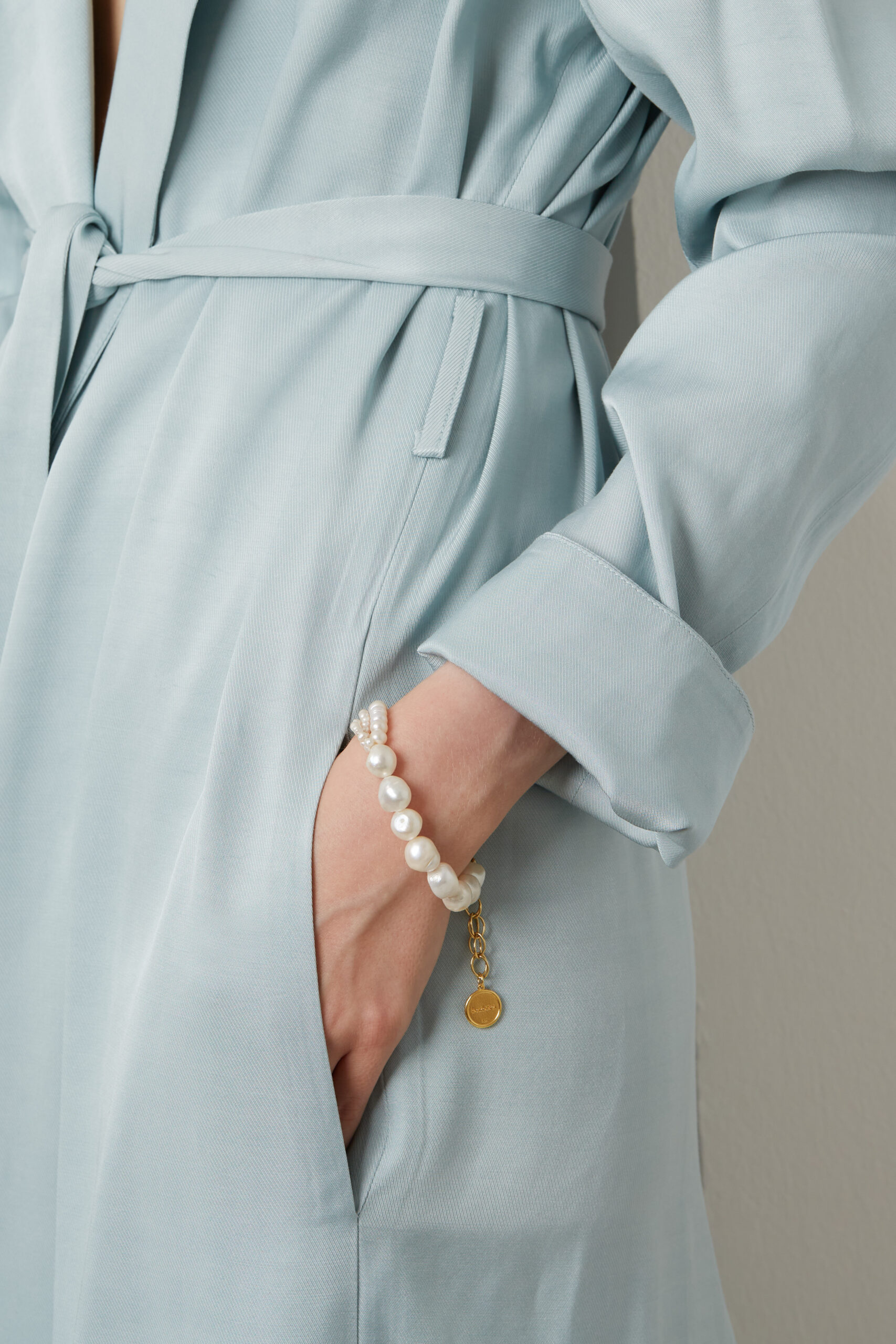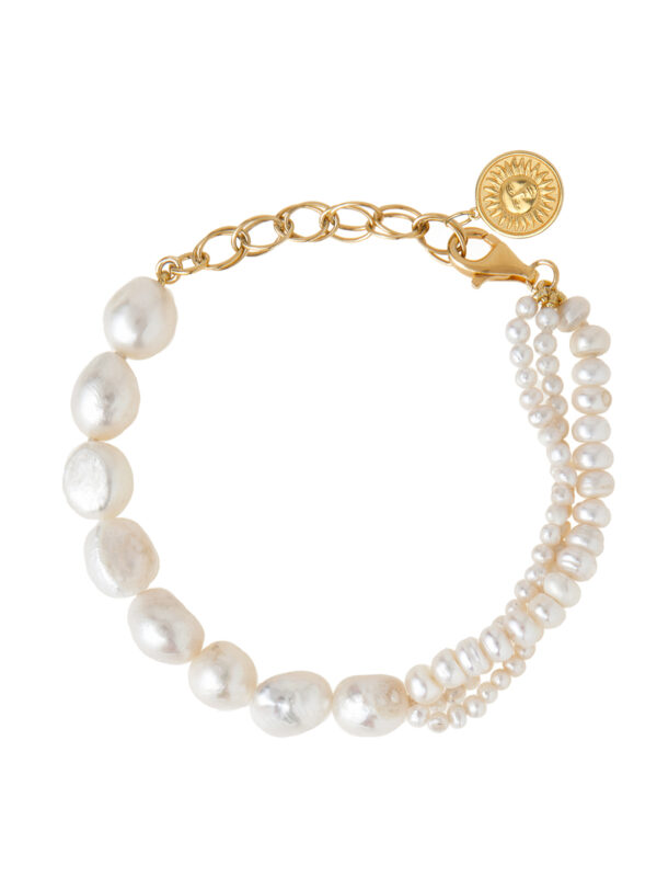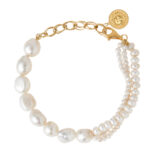 A handmade bracelet consists of different sizes and styles of pearls.